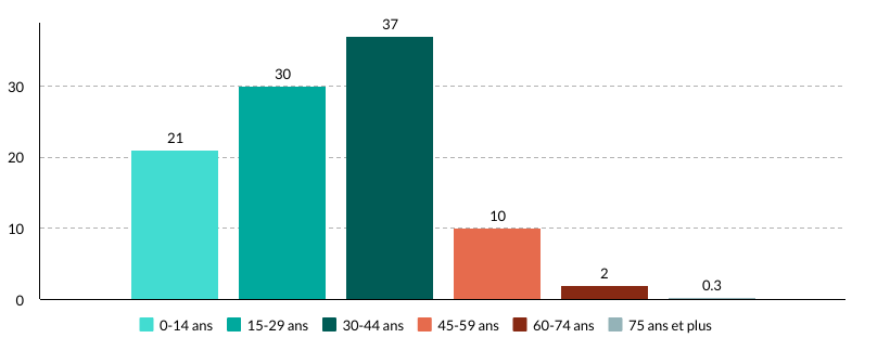 Répartition selon l’âge des personnes ayant déposé une demande d’asile au Québec entre 2015 et mai 2024 (en %)