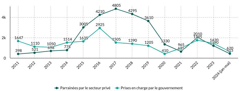 * 2015 – Alors que les personnes réfugiées prises en charge par l’État (RPCE) étaient deux fois plus nombreuses que les personnes réfugiées parrainées par le privé (RP), la tendance s’est inversée à partir de 2015 avec l’arrivée des personnes réfugiées syriennes.