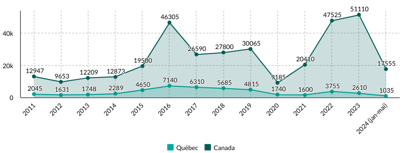 Nombre de personnes ayant demandé l’asile au Québec et au Canada entre 2011 et mai 2024