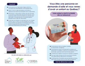 La Maison Bleue, en collaboration avec le PRAIDA et le CERDA a créé une infographie afin d’accompagner les parents en demande d’asile dans les démarches d’inscription de leur nouveau-né·e à la RAMQ. Cette infographie est disponible en 5 langues (français, anglais, espagnol, créole et pendjabi), n’hésitez pas à l’imprimer et la partager aux patient·e·s que vous rencontrez !