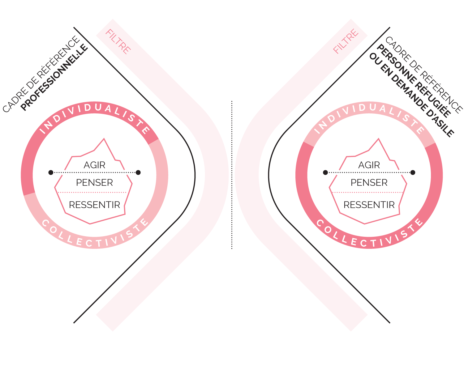 Dans le contexte de la rencontre, la ou le professionnel·le s’inscrit comme une personne représentante de la société d’accueil. Elle incarne une culture professionnelle basée sur le respect de la personne qu’elle accompagne, tout en véhiculant sa vision du monde et son système de valeurs.