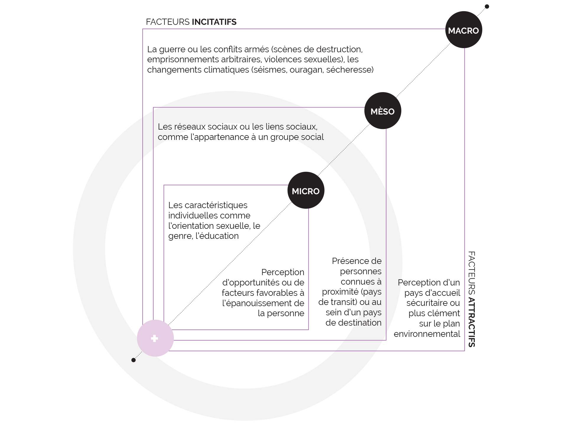 La migration humaine est un processus complexe. Selon le modèle d’analyse écosystémique développé par les démographes Turton (2003) et Williams et al. (2012), la migration dépend de facteurs dits incitatifs (push), qui poussent la personne à quitter son pays d’origine, et de facteurs dits attractifs (pull), qui sont propres au pays de destination.
