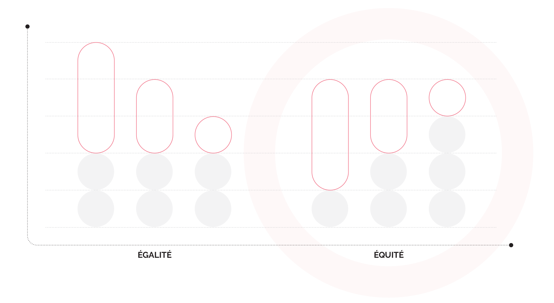 Toutefois, cette égalité ne garantit pas que les services correspondent réellement aux besoins des personnes : elle ne garantit pas l’équité. La notion d’équité renvoie au fait de doter les personnes du soutien et des outils nécessaires afin qu’elles bénéficient pleinement des ressources et services offerts par la société, et puissent répondre à leurs besoins spécifiques.